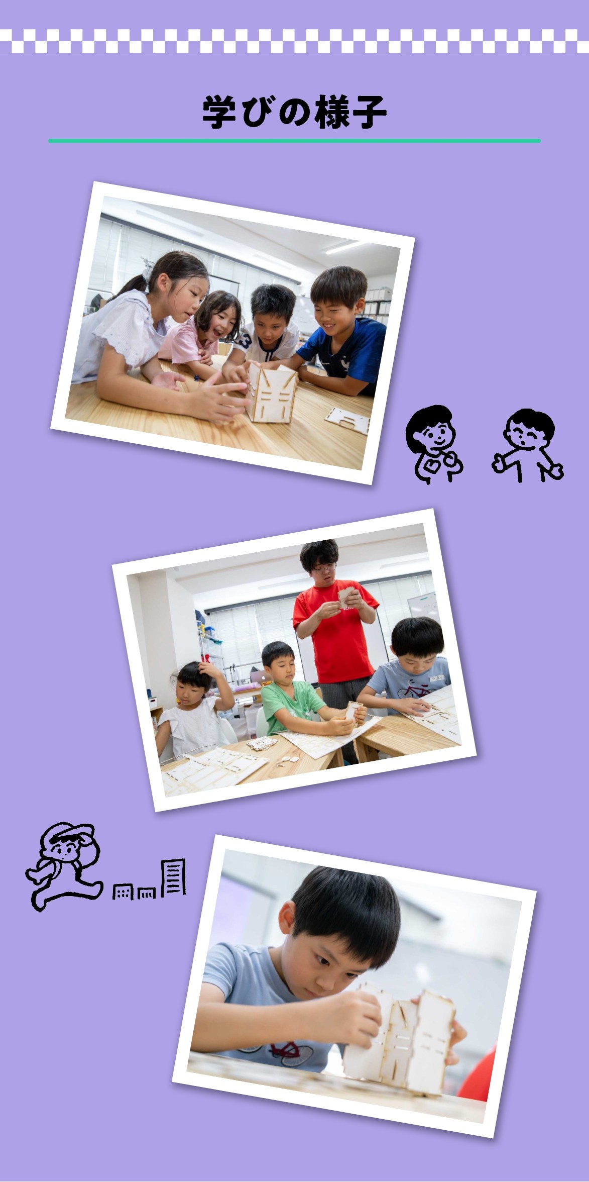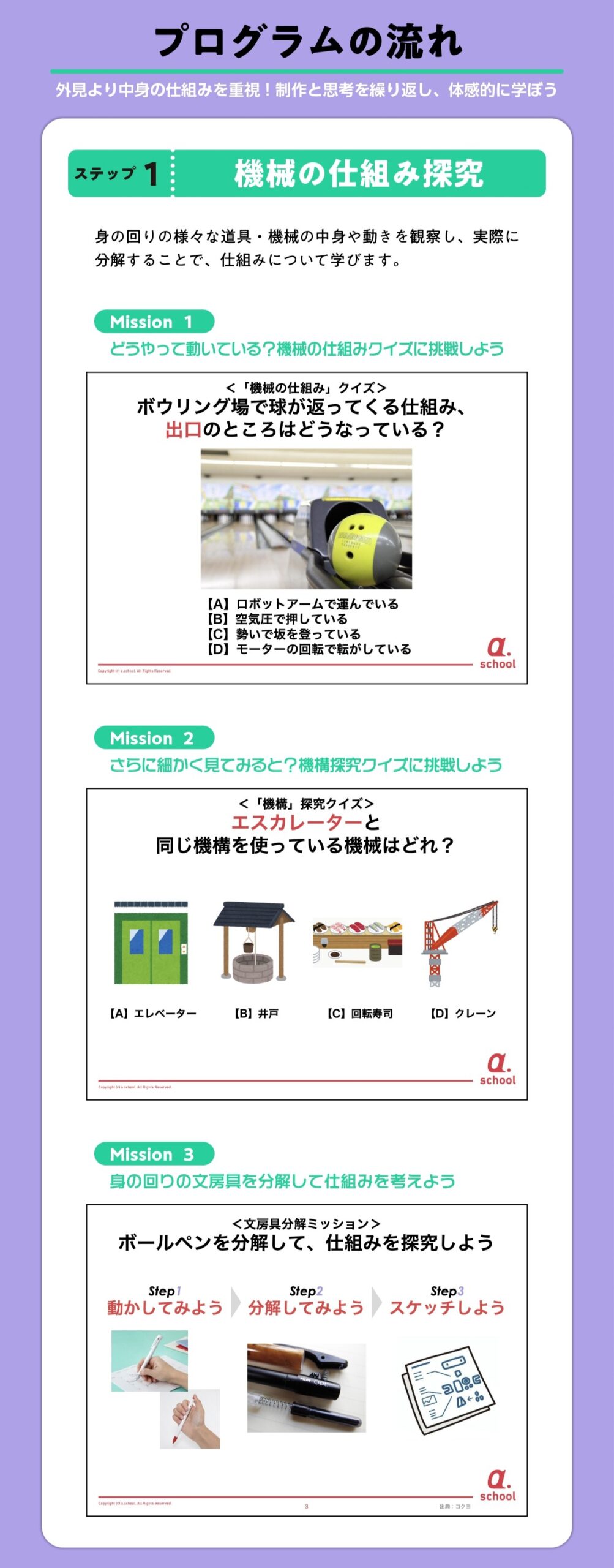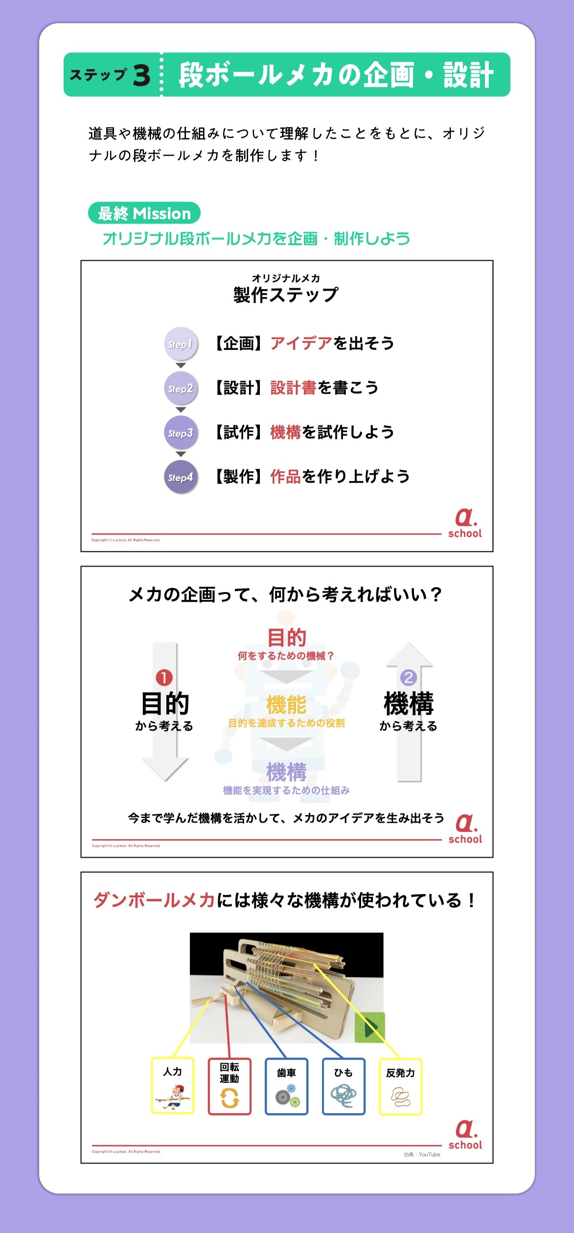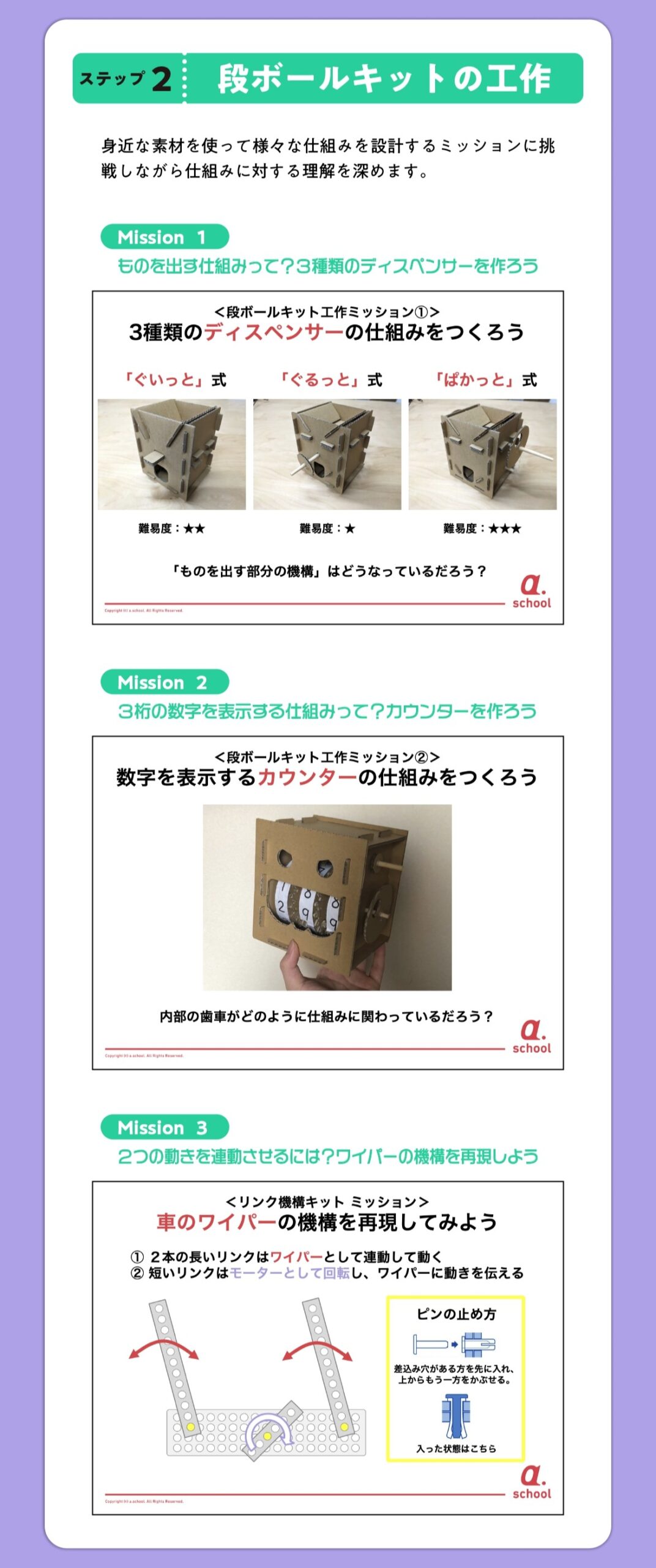 このプログラムでは、外見の良し悪しではなく、機械の鍵となる動きや構造を、ダンボールのような身近な素材を使っていかに再現するかということを重視しています。身の回りの機械に対する視線が変わるのはもちろんのこと、自由研究にもおすすめです!