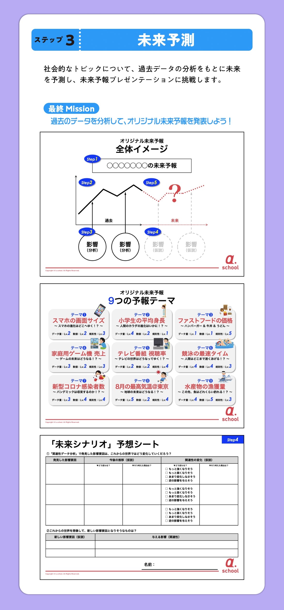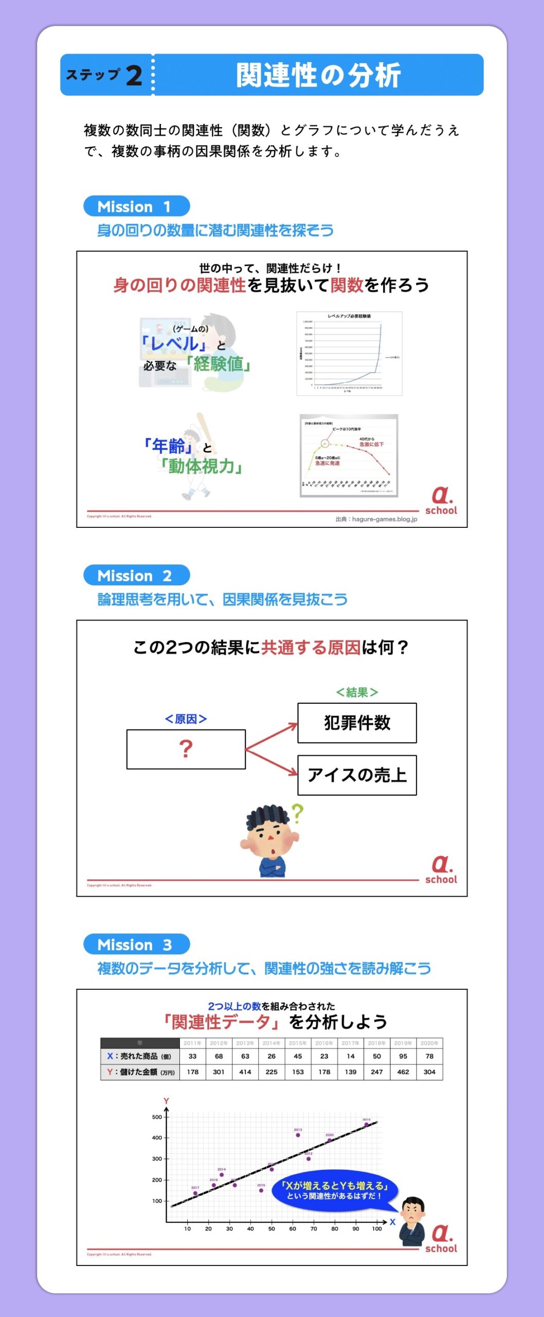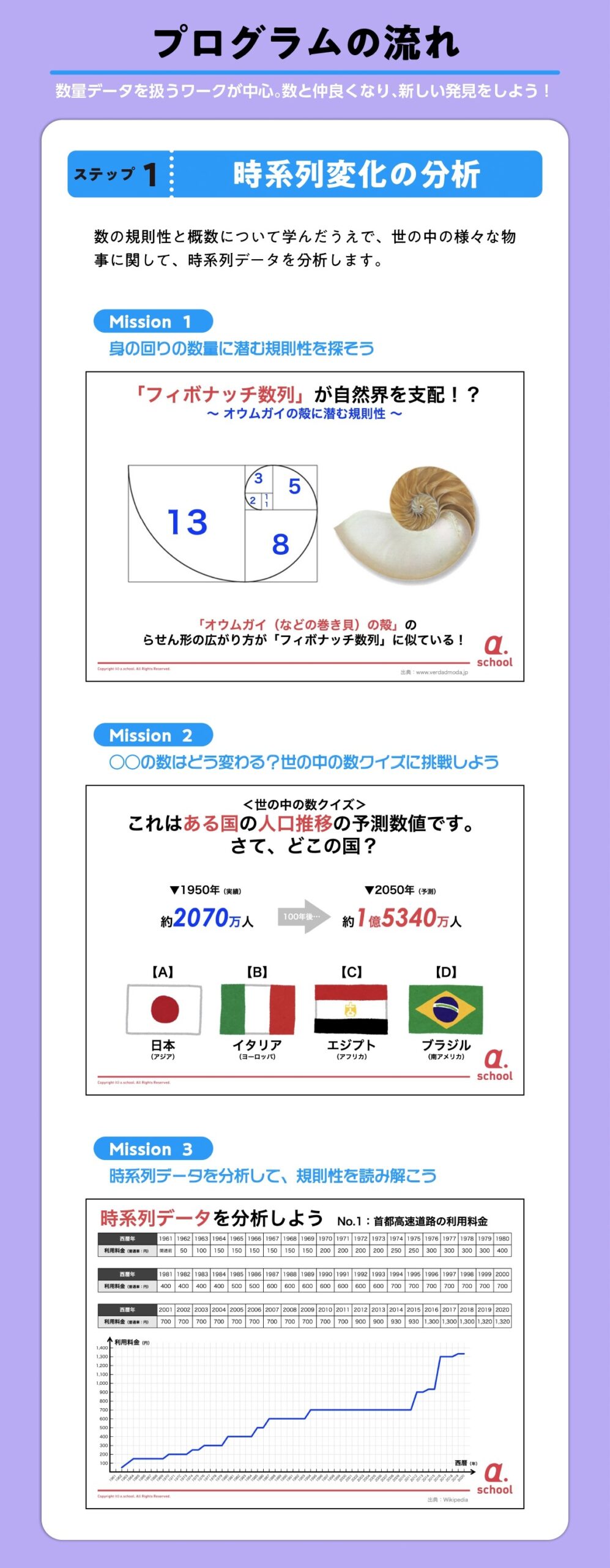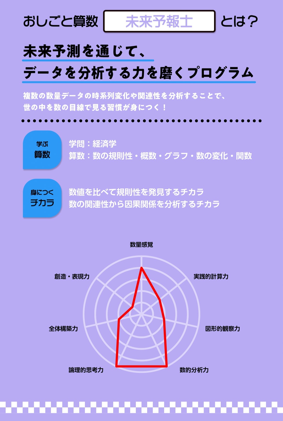 複数の数量データを比較したり、時系列変化を観察したりしながら未来を予測するこのプログラムでは、「概数」「関数(比例・反比例)」「数列」といった算数だけでなく、「システム思考」(ものごとの因果関係を分析する力)も養います。