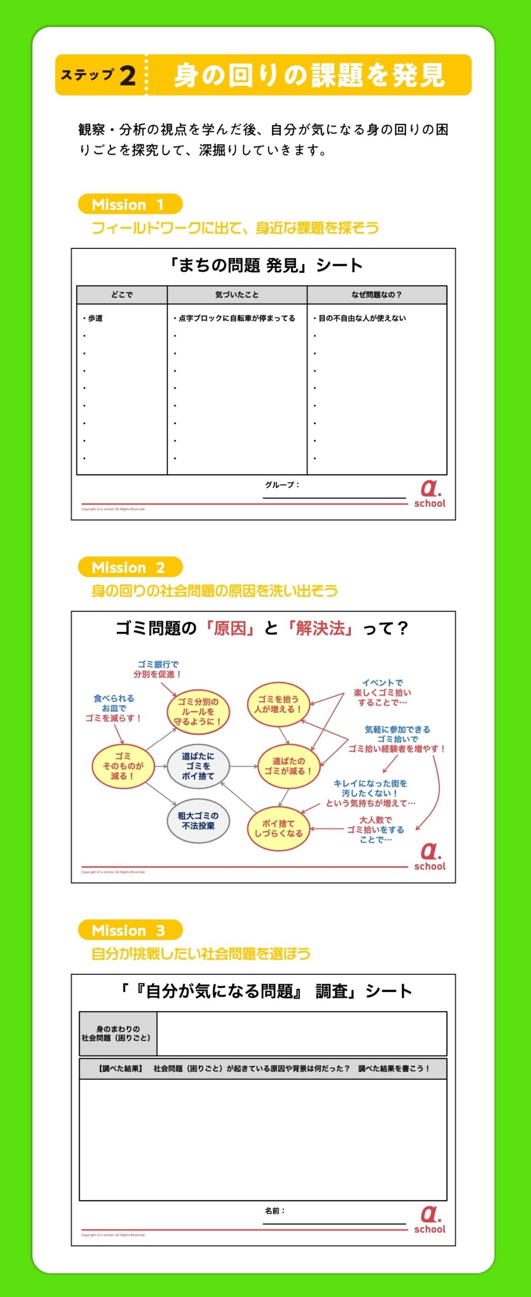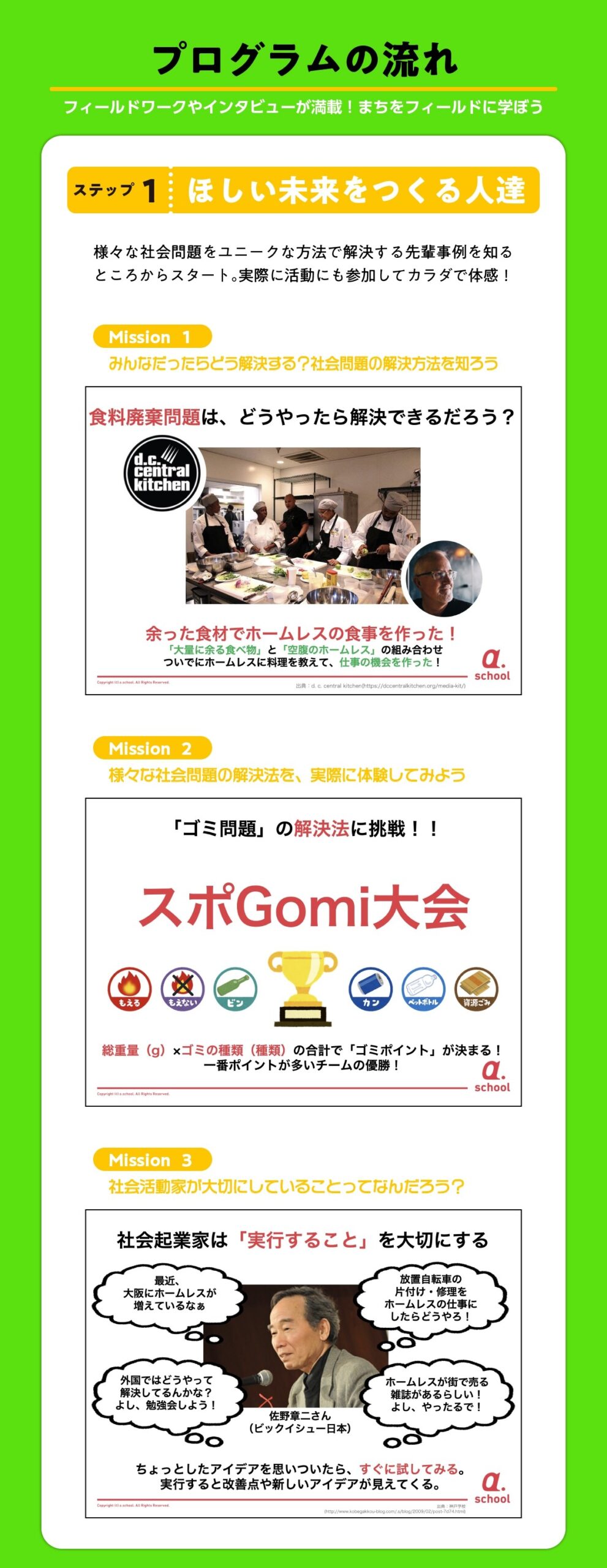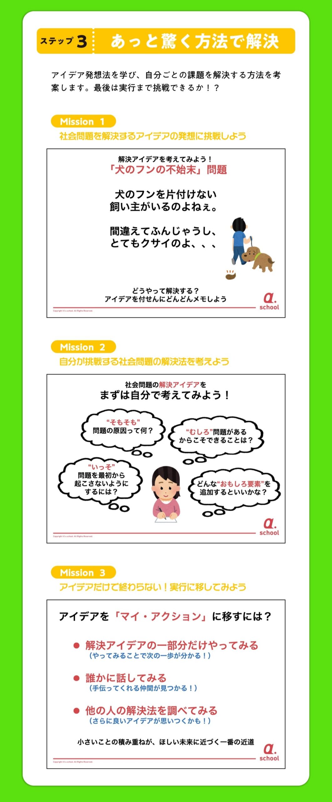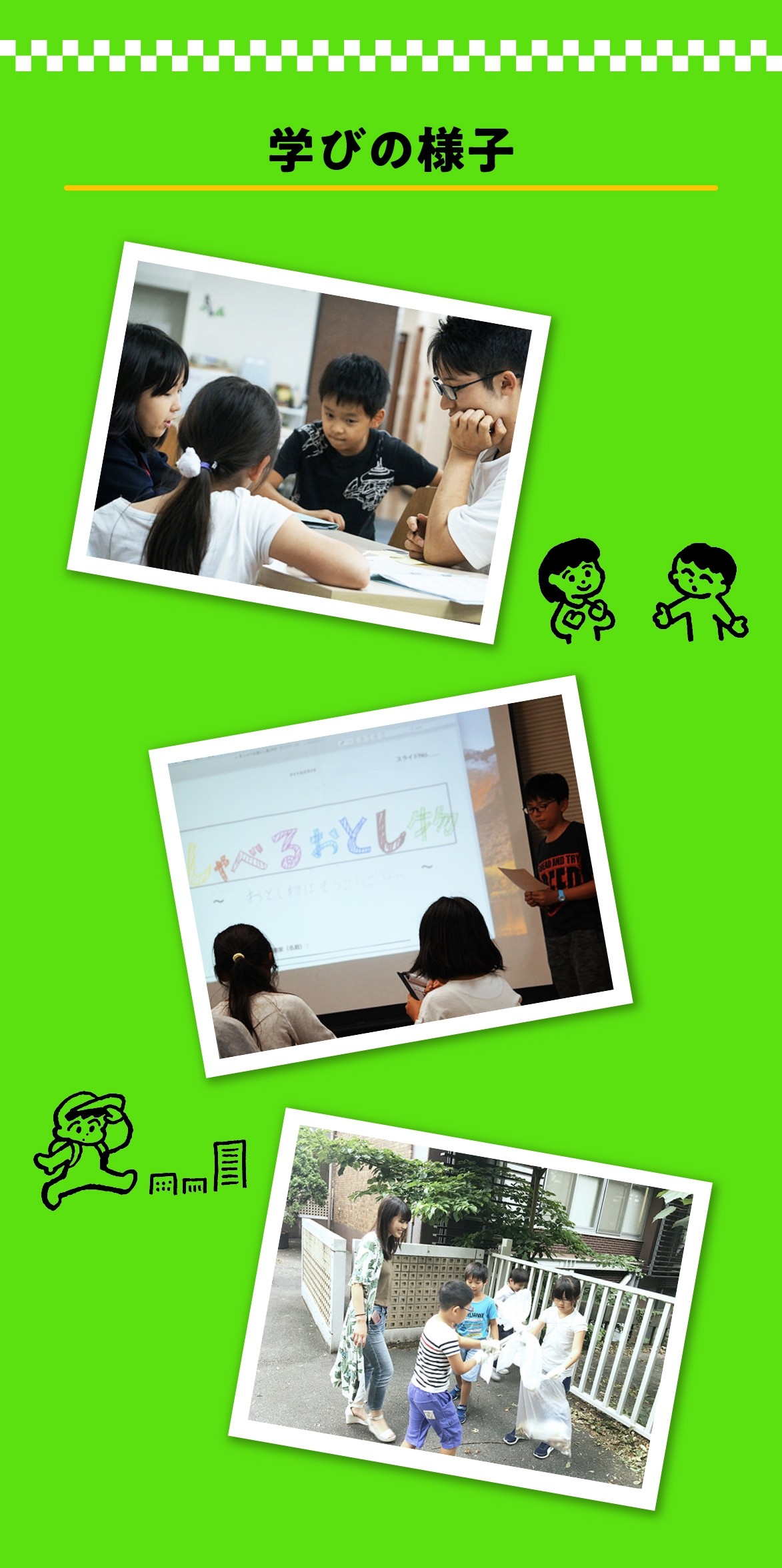 問題を解決するのは、なにも政治家や大企業だけではないことを知るのも、このプログラムのポイント。小学生でもできること、身の回りにある素材や人手を借りる知恵など、創意工夫を凝らすコツも学びます。
