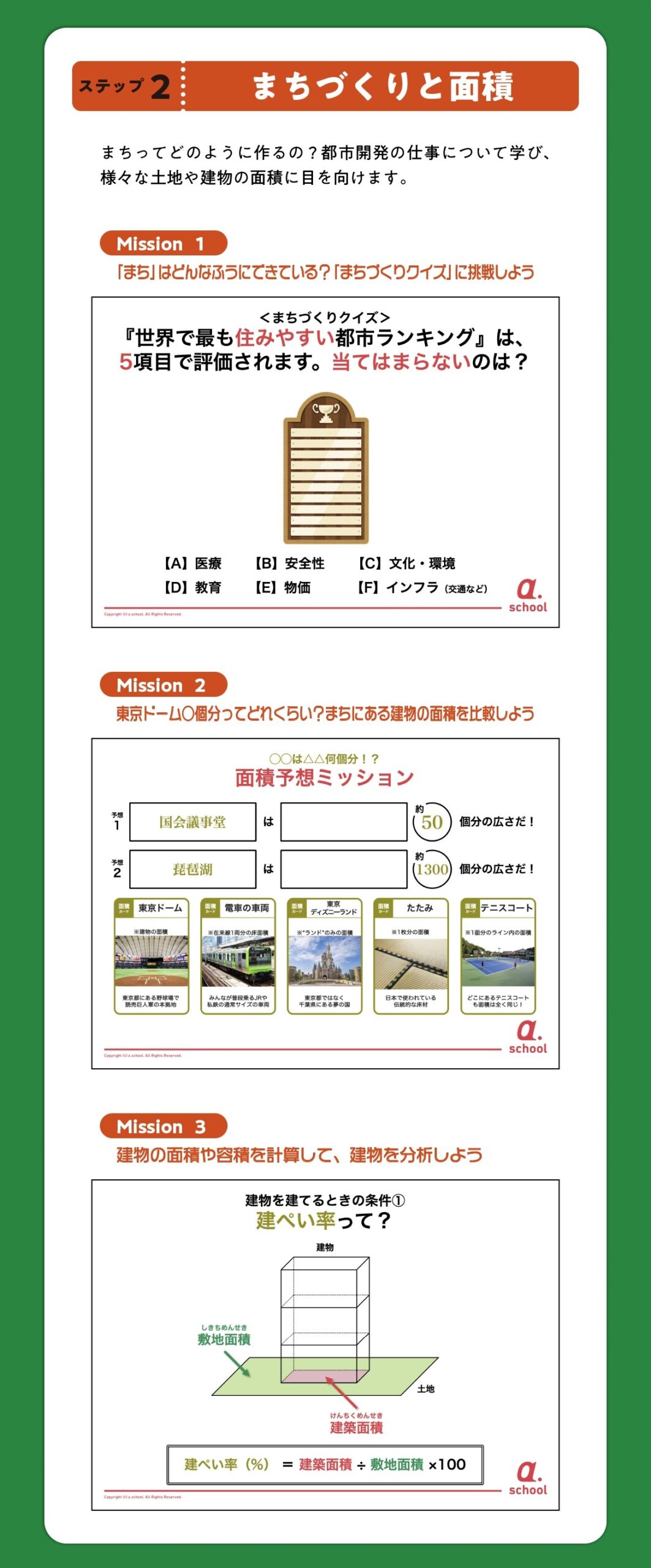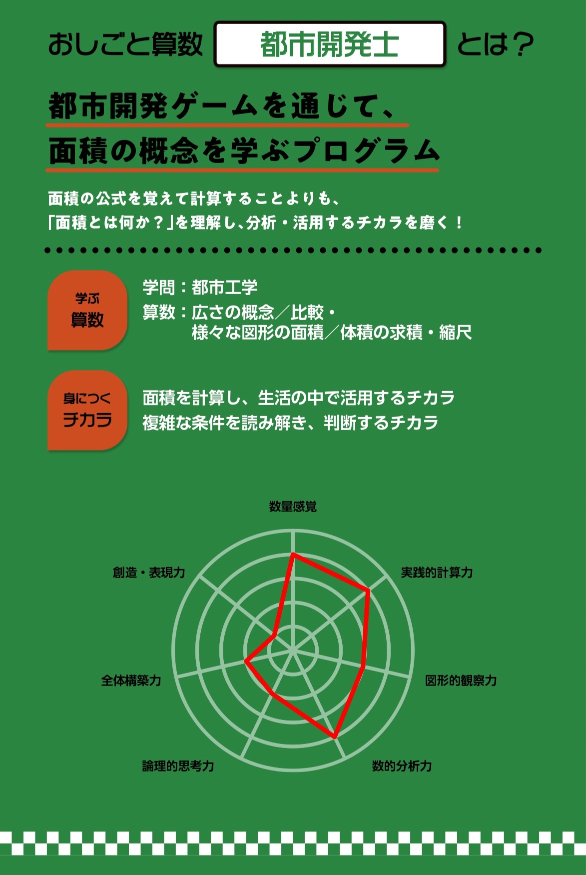 計算トレーニングに偏りがちな縮尺と面積の学習。都市開発ゲームに挑戦しながら、縮尺と面積の考え方や数字の条件を読み解く力を習得しよう!身の回りのまちの成り立ちにも自然と興味がわいて、日々のまち歩きもぐっと楽しくなります。