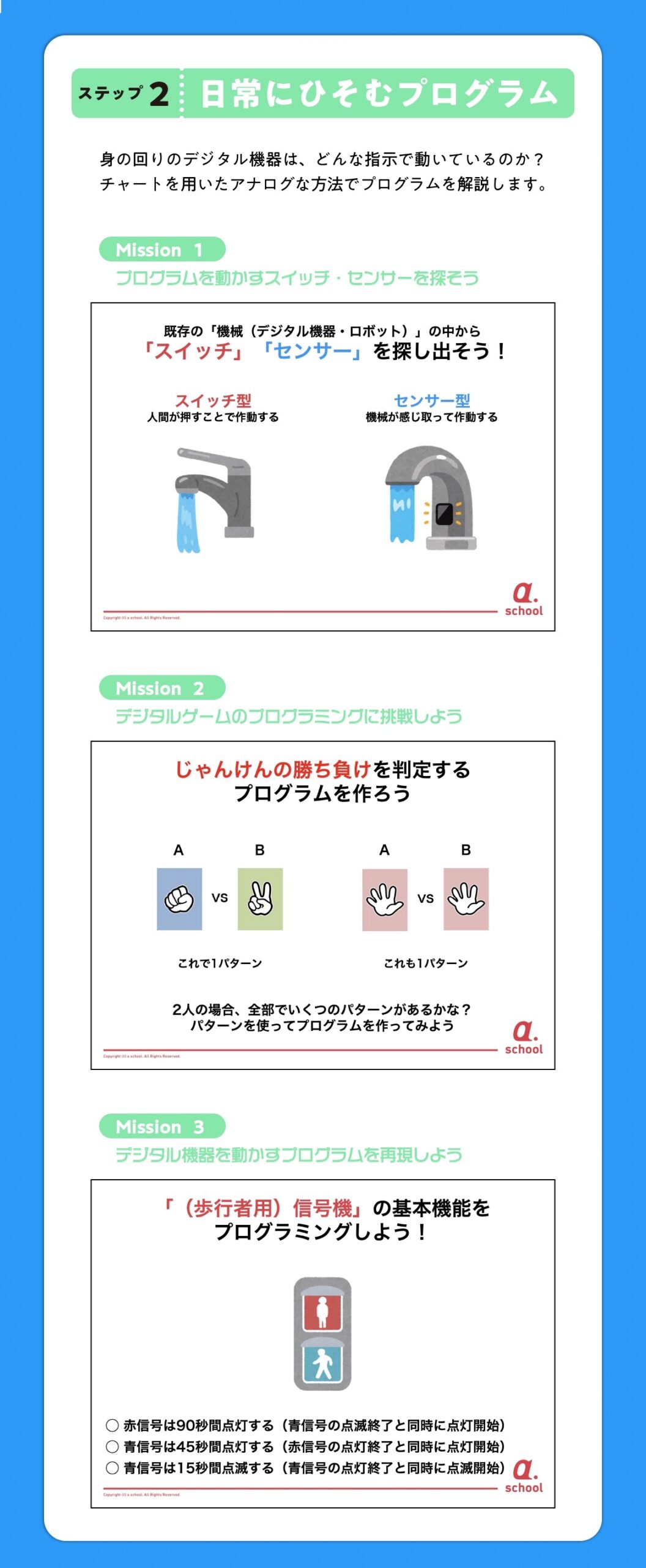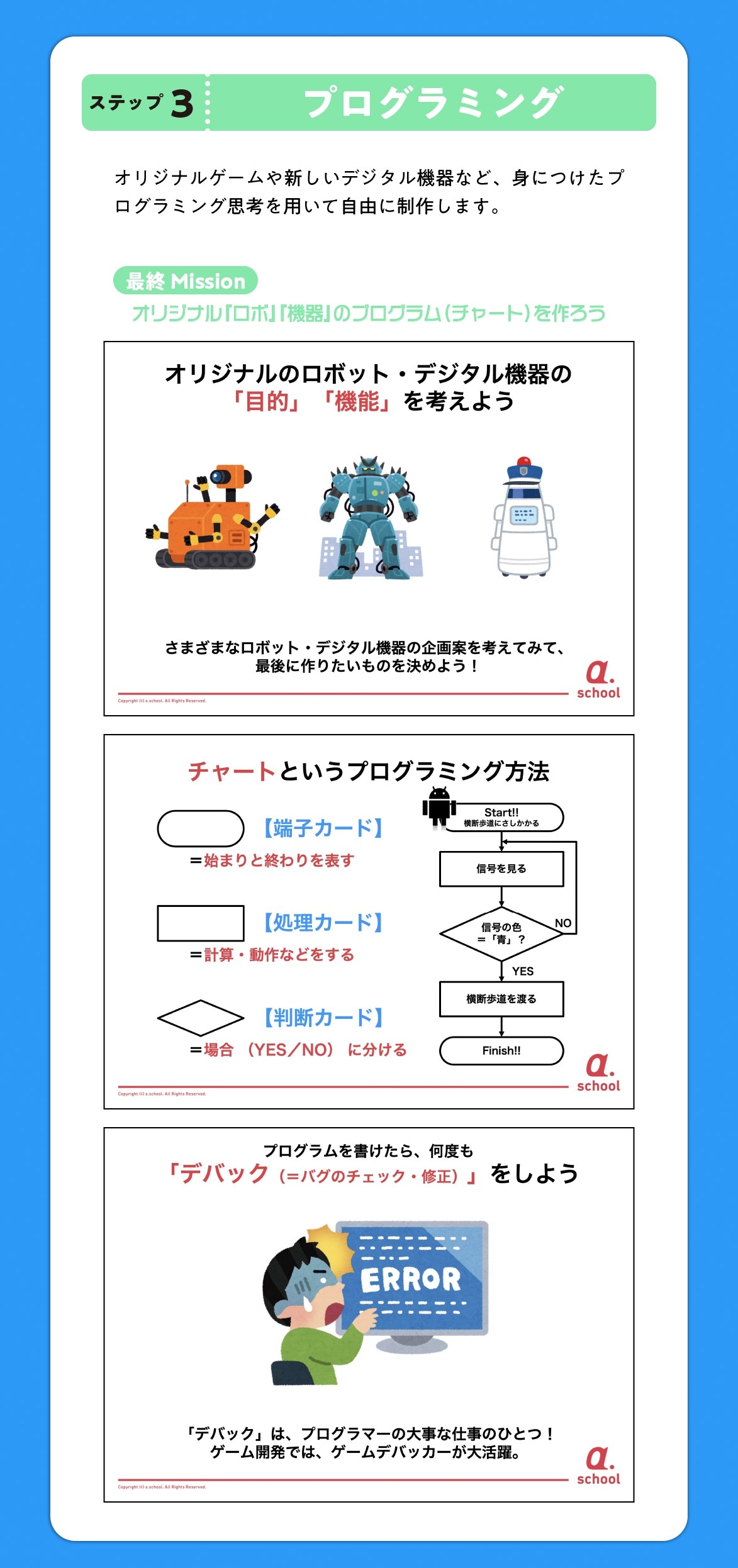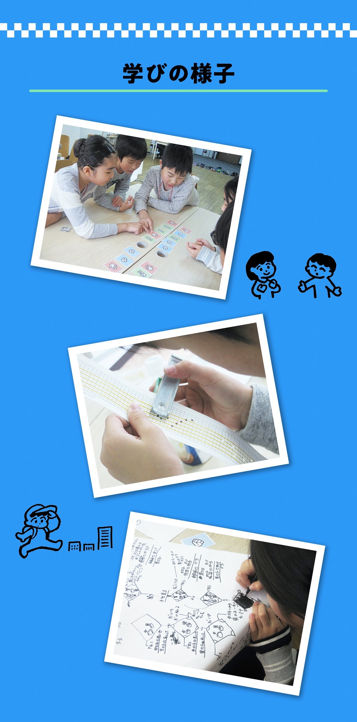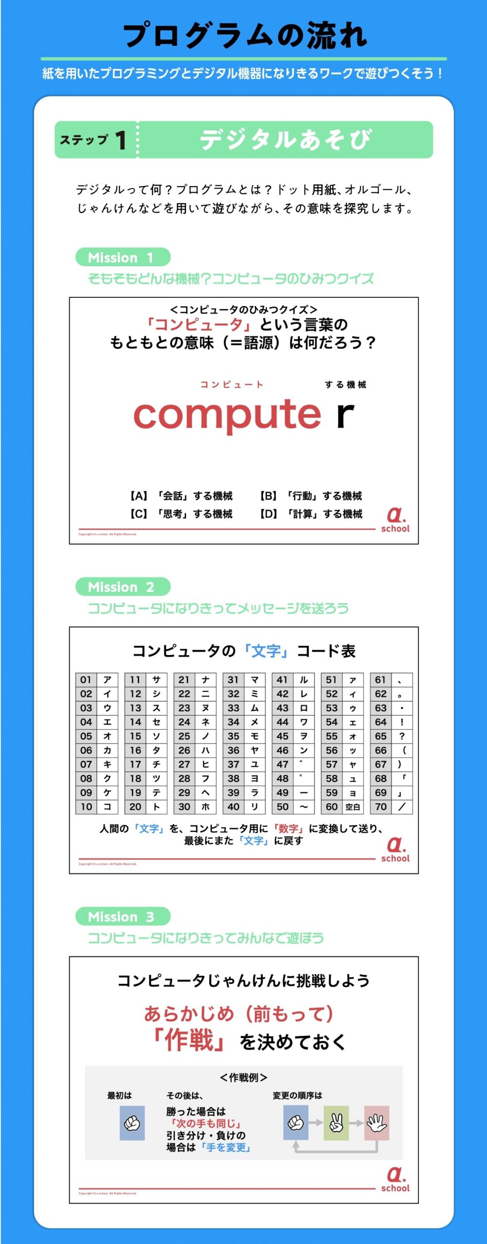 パソコンを使って指示(コード)を書いて・・・と始める前に、あえて紙やペン、工作などのアナログな方法をとることで、プログラミングの考え方そのものをじっくり学びます。